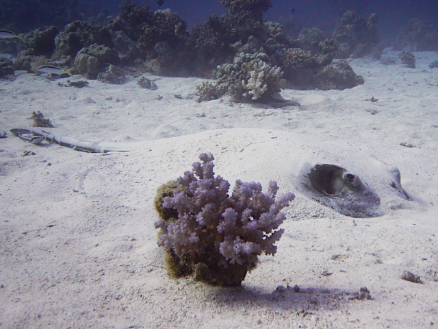 Dieser Federschwanzstechrochen hat sich scheinbar ein tolles Versteck gesucht. Halb eingegraben „versteckt“ er sich hinter dieser „riesigen“ Koralle. 🙂