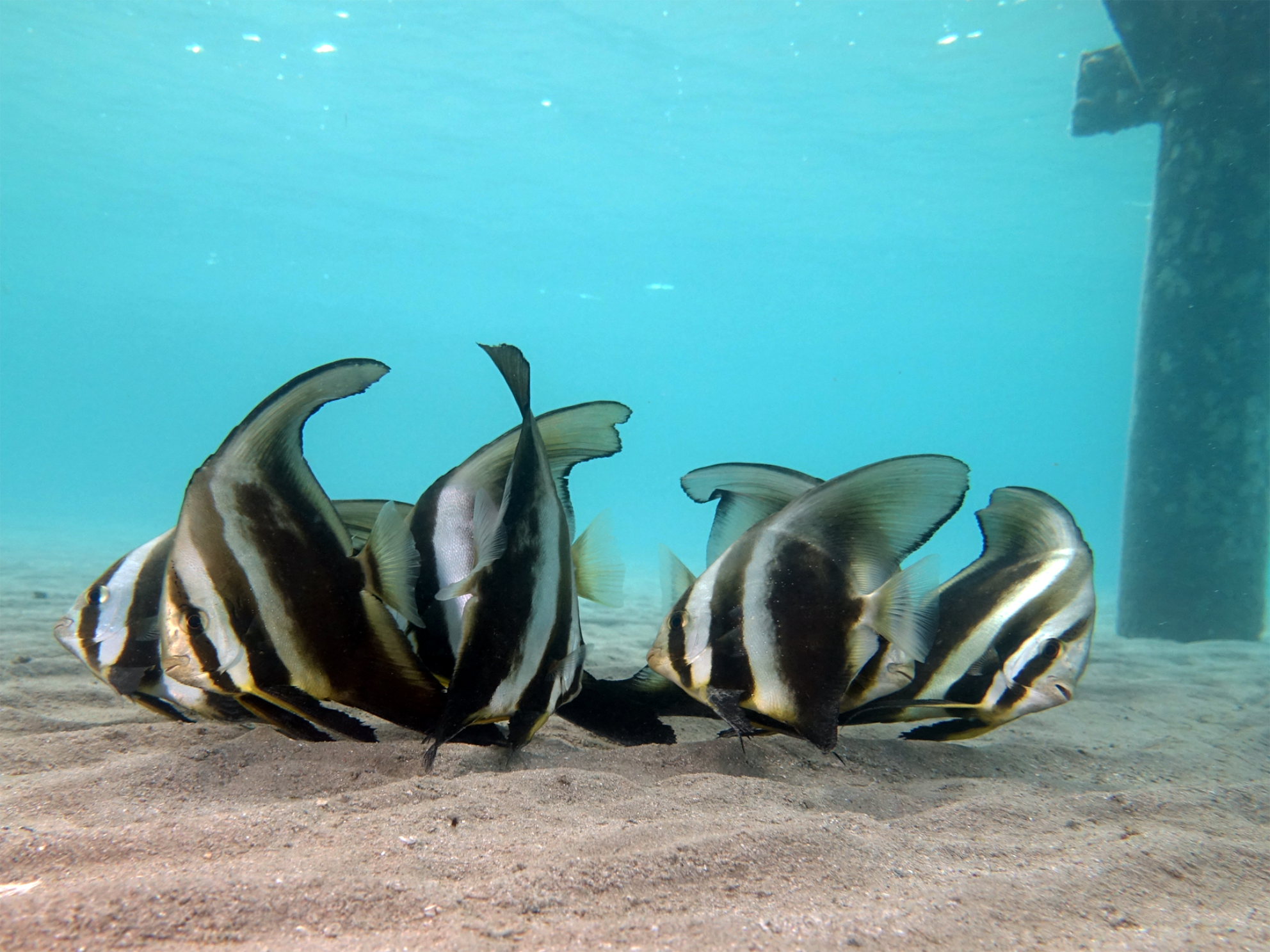 Farid führte die Tauchgruppe: „Am Wrack in Shaab Quais haben wir diesen Fledermausfisch getroffen. Zuerst schaute er noch etwas schüchtern und verhalten zu uns herüber. Dann kam er aber mitten in unsere Tauchgruppe und fühlte sich sichtlich wohl.