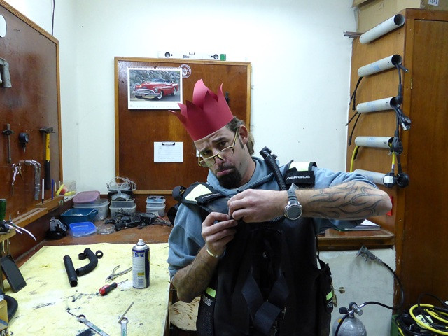 Währenddessen gerade im Trockendock unsere Boote wieder chic gemacht werden, wird natürlich auch auf der Basis die Winterzeit für alle anfallenden Wartungsarbeiten genutzt. Momentan revidiert der König des Workshops unsere Jackets und gleichzeitig stehen auch schon die Atemregler in den Startlöchern. Da dies sehr zeitaufwendig ist, wird er damit über einen längeren Zeitraum beschäftigt sein. Und wie man ihn kennt, ist er während der Arbeit für jeden Spass zu haben…..