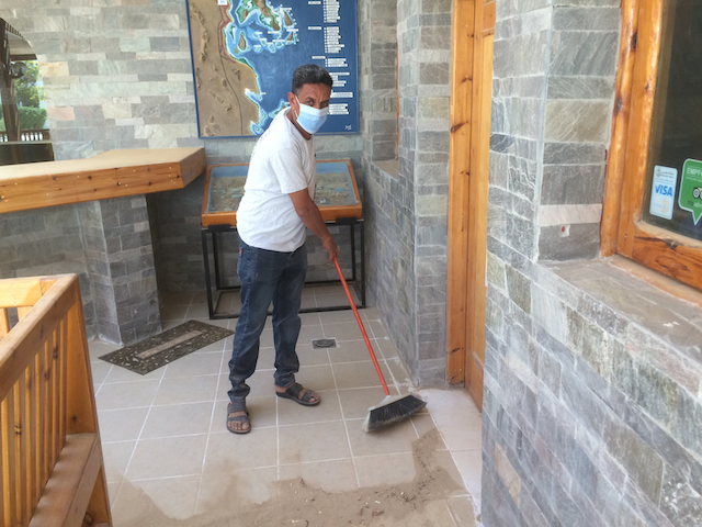 Aber natürlich musste zuvor die Tauchbasis erst einmal vom ägyptischen Staub gereinigt werden. Selbstverständlich war auch unser langjähriger Barkeeper und „Putzteufel“ Hassan mit dabei und hat den Barbereich gesäubert. Für viele ist Hassan ja auch der wichtigste Mann auf der Tauchbasis! 😉