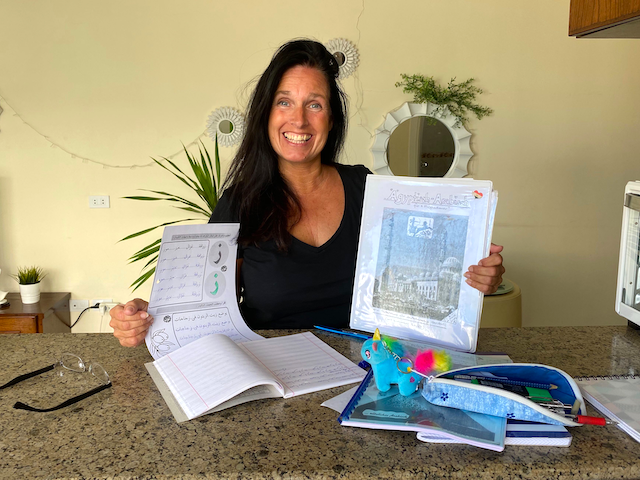 Unsere Office Fee Katy zum Beispiel vertieft weiter ihre Arabisch Kenntnisse. Schon vor der Corona Krise hat Katy fleissig die Sprache ihres Gastlandes gelernt. Nun nutzt sie die Zeit um die Kenntnisse zu intensivieren. Sehr fleissig! Man beachte übrigens die Einhorn Federtasche!